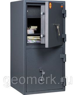 Сварная конструкция. Толщина стенок достигается за счет стали повышенной прочности, а также за счет прослойки с инертным материалом (бетоном) между стальными листами сейфа. Состоит из двух секций. Внутри верхней секции имеется одна полка и трейзер, запирающийся на отдельный замок. Внутри нижней секции установлена одна полка.