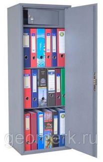 Сейф металлический офисный ШМ-120Т. Габариты внешние (ВхШхГ): 1203х440х365мм. Габариты внутренние (ВхШхГ): 1016х436х300мм. Толщина металла: толщина стенок корпуса 1,2мм. Толщина двери 1,5мм. Сварная конструкция. Внутри расположены две съемные полки. Предусмотрена возможность крепления сейфа к стене. Сейф оборудован внутренним трейзером, запирающимся на отдельный замок. Сейф запирается на 8-ми сувальдный ключевой замок с ригельной системой запирания. Специальная ригельная система запирания двери позволяет предотвратить попытки вскрыть сейф путем воздействия на петли. Окрашен порошковой эмалью серого цвета. Вес: 37кг. None