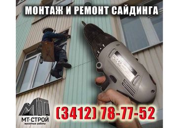 Компания МТ Строй осуществит монтаж сайдинга любого вида: цокольный сайдинг, цементный сайдинг, виниловый сайдинг, алюминиевый сайдинг, стальной сайдинг или деревянный сайдинг Наши специалисты помогут выбрать более оптимальный для Вас вариант и выполнят заказ точно в срок. Мы гарантируем высокую скорость работ, качество и низкую стоимость монтажа. В случае ремонта сайдинга, все работы выполняются методом промышленного альпинизма — без дополнительных затрат и времени на установку строительных лесов. тел. (3412) 78-77-52; 8-912-747-23-70 Сайт: http://mtstroy18.ru/