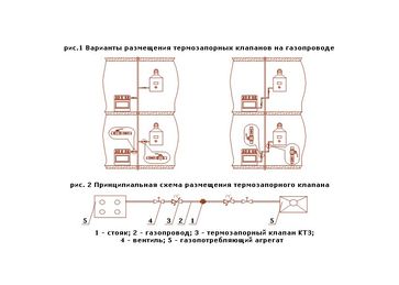 Клапаны термозапорные(КТЗ) предназначены для автоматического прерывания подачи газа к газопотребляющим приборам при возникновении пожара,предупреждения взрыва газа,с целью облегчения борьбы с огнем, снижения тяжести последствий пожара, снижения травматизма пожарных расчетов и персонала предприятия.Клапаны термозапорные всегда должны быть смонтированы в помещениях, где размещены установки для сжигания газа. Клапаны термозапорные всегда должны быть смонтированы первыми на вводе газопровода в помещении, либо на отводе от стояка. Не допускается установка клапана КТЗ за пределами помещений, после установки любой другой газовой арматуры, на байпасах, в соседних (смежных) помещениях, в местах где температура окружающей среды при работе газовых установок может подниматься свыше 60°С.Применение термозапорных клапанов (КТЗ) предписывается «Правилами пожарной безопасности» ППБ-01-03 п.84.