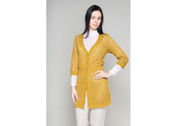 Кардиган из льна (пряжа). Силуэт прямой, на талии фиксируется резинкой.
