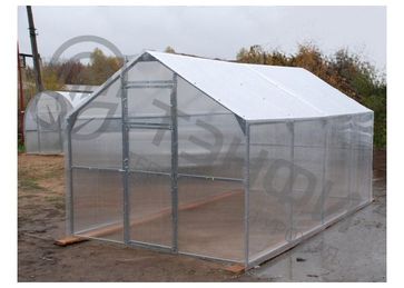 Изготолены из стальной квадратного профиля с оцинковкой. Это наиболее прочный и долговечный материал каркаса теплиц из всех представленных на современном рынке. Использование оцинкованной стали производства Новолипецкого металлургического комбината обеспечивает каркасу теплицы повышенную жёсткость, упругость, а также устойчивость к коррозии и, следовательно, долговечность. Основной квадратный профиль с сечением 25х30мм изготовлен из оцинкованной стали толщиной 1мм, а крепежные элементы — из оцинкованной стали толщиной 2 мм, что придает узлам конструкции повышенную прочность. Теплица устанавливается на фундамент и грунт. С обеих торцов 2 двери и 2 форточки.
