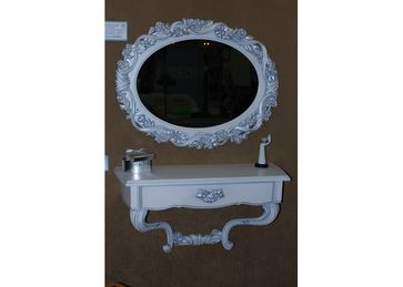 Комплект для спальни из двух предметов: консоль 920*550(в)320(гл) и резное зеркало900700, выполнен из 100% массива берёзы, покрыт серебряной патиной, резьба ручная. Продается только комплектом