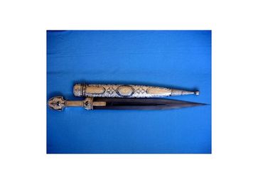 Кинжал серебряный сувенирный: Серебро 875 пробы, круговая гравировка, чернь, кинжал украшен резными накладками из слоновой кости, ручная работа кубачинских мастеров. Длина — 67 см. Клинок — булат. На клинке резная накладка из слоновой кости и клеймо мастера.Количество серебра на изделии ---- 850гр.