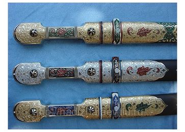 Кинжал кавказский в мельхиоре, эмаль. Ножны украшаются традиционным кавказским орнаментом, выполненным чеканкой и гравировкой. Клинок коррозионно-стойкая сталь 40Х13. Качество очень хорошее. Общая длина кинжала 540мм. Кинжал один из самых популярных видов холодного оружия. В свое время он выступал в качестве и предмета самообороны, и изысканного мужского аксессуара, и столового прибора.