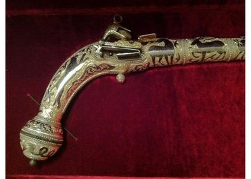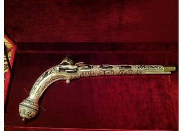 Сувенирный пистолет: серебро 875, гравировка, чернь, позолота, ручная работа кубачинских мастеров особой сложности. Длина - 50 см. Вес серебра на изделии - 800 гр. Прекрасный серебряный подарок любимому мужчине, который коллекционирует предметы ювелирного искусства!