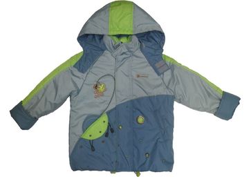 Куртка выполнена в спокойном сером цвете, украшена люверсами различного диаметра, имитирующими иллюминаторы. Капюшон большой, регулируемый, Отделка зеленого цвета.