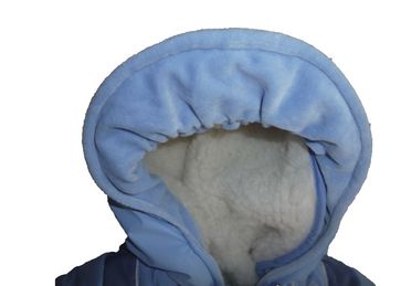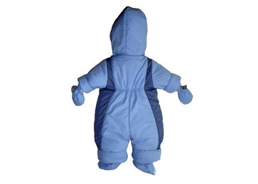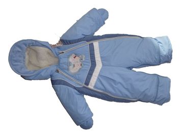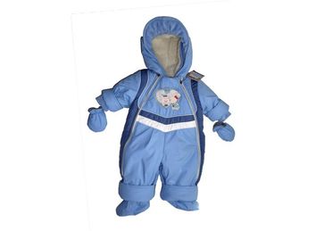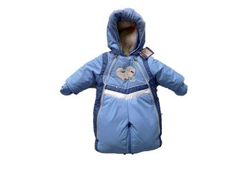 Комбинезон - трансформер выполнен классическим образом: две молнии по бокам, съемный меховой вкладыш, пинетки. Украшения - аппликация или вышивка. Цвет для мальчиков преимущественно голубой, может быть с добавлением белых вставок.