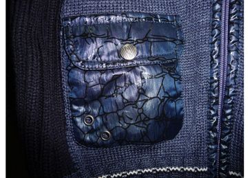 Карманы накладные, отделаны тканью. Рукав - реглан. На рукавах - широкие трикотахные лампасы.