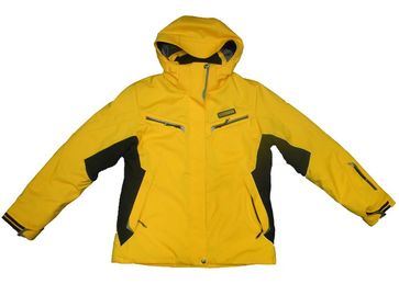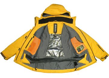 Верх выполнен из плотной плащевой ткани. Куртка желтого цвета с черными вставками. Брюки - черного цвета, классического покроя, с помочами.