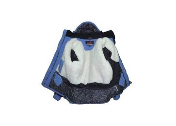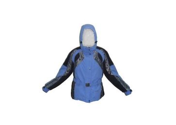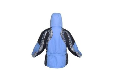Костюм горнолыжный женский состоит из куртки с меховым подкладом и полукомбинезона. Куртка классического спортивного покроя, имеет пояс. Цвет синий. Вставки серебристые. Куртка застегивается на молнию с защитным клапаном. Внутри куртка имеет два кармана и снегозащитную юбку.