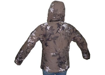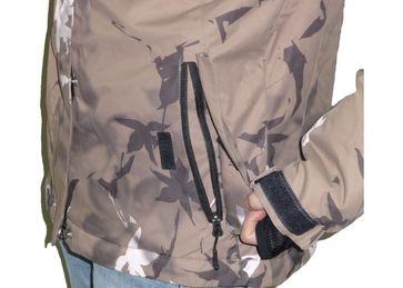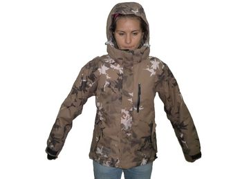 Костюм горнолыжный женский выполнен по классическим лекалам. Главное отличие его в оригинальной окраске куртки: основной цвет хаки с перламутровым отливом и на этом фоне в хаотическом порядке расположены розовые и черные листья.