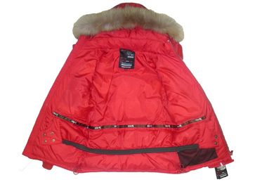Верх куртки выполнен из плотной, тонкой на ощупь плащевой ткани. Подкладка выполнена из плотного капрона, не имеет общих с пуховым пакетом швов, то есть не позволяет пушинкам вылезать через швы и пачкать одежду.