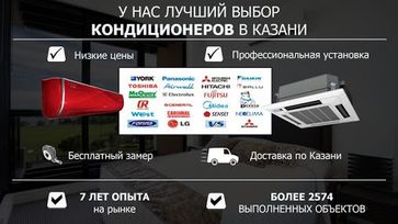 Наша компания поможет быстро, качественно и надёжно выполнить Установку кондиционеров в Казани и по всему Татарстану с гарантией и необходимым пакетом документов. Наши специалисты своевременно выполнят все необходимые работы, помогут вам купить кондиционер предварительно проконсультировавшись у наших менеджеров.