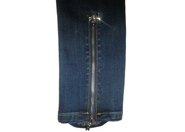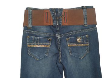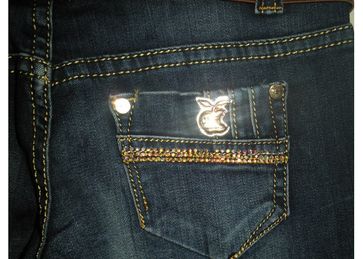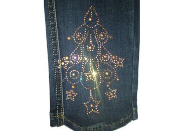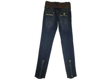 Широкий пояс с пряжкой. Стразы в виде букета на нижней части брюк спереди. На нижней части сзади имеется молния, облегчающая надевание брюк. Спереди брюки удлинены в виде широкого языка, прикрывающего шнуровку кроссовок. Передний карман и задние карманы украшены стразами в виде полосок.