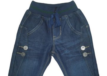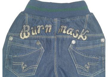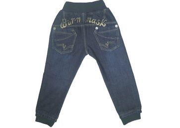 Брюки для малышей выполнены из джинсовой ткани, но опушка и манжеты выполнены из трикотажной синтетической ленты. Производство фирмы "Овас".