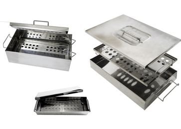 Камера жидкостной стерилизации медицинских инструментов предназначена для стерилизации инструментов в жидких дезинфицирующих растворах. Так же может применяться для хранения и транспортировки.Камера представляет собой прямоугольную емкостьс крышкой, которая предотвращает попадание паров активных веществ в атмосферу, защищая медицинский персонал от вредных испарений, а утопитель, которым снабжена камера, обеспечивает гарантированное погружение инструментов в раствор. Внутри камеры находится перфорированная выдвижная полка для размещения на ней инструментов. Наличие перфорированных полок в каждом контейнере существенно облегчает труд медицинского персонала во время дезинфекционной обработки медицинских инструментов и предметов медицинского назначения, кроме того предохраняет от контакта с дезинфекционными средствами средства.Изготовлена из пищевой нержавеющей стали, что значительно продлевает срок службы камеры.Благодаря тому, что камера изготовлении из высококачественного металла, в ней можно производить стерилизацию подогревая дезинфицирующий раствор в пределах рабочих температур раствора.Габаритные размеры: 355х105х50мм, 360х210х100 мм, 560х380х100мм.