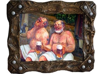 Картины для бани с веселыми изображениями сделают интерьер успокаивающим, располагающим к процессу очищения тела и духа, повысят настроение. Рамка для картин изготовлена из натурального состаренного дерева, изображение – печать на искусственном холсте. Многочисленные варианты рисунков и видов рамок позволяет заказчику реализовать свои предпочтения. Размер изображения - 30см*40см. По желанию клиента можно изготовить картины других размеров; в таком случае цена изделия будет изменена.