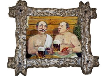 Картины для бани с веселыми изображениями сделают интерьер успокаивающим, располагающим к процессу очищения тела и духа, повысят настроение. Рамка для картин изготовлена из натурального состаренного дерева, изображение – печать на искусственном холсте. Многочисленные варианты рисунков и видов рамок позволяет заказчику реализовать свои предпочтения. Размер изображения - 30см*40см. По желанию клиента можно изготовить картины других размеров; в таком случае цена изделия будет изменена.