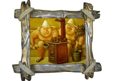 Картины для бани в комнате отдыха сделают интерьер бани успокаивающим, располагающим к процессу очищения тела и духа, повысят настроение. Картины с веселыми изображениями в раме из состаренного дерева для бани и сауны станут украшением бани, предметом гордости, символом вашего благополучия и комфорта. А, если Ваша баня уже оформлена достойным образом, то картины для бани и сауны – прекрасный подарок друзьям, у которых декоративные проблемы интерьера ещё не решены.