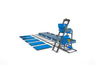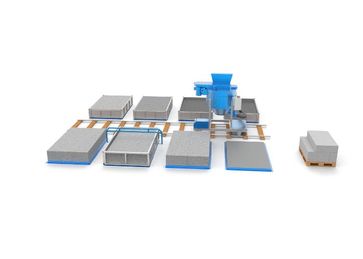 Линия состоит из самоходного смесителя емкостью 700 литров, блока дозаторов с электронным весовым терминалом, стационарно смонтированных форм и шаблона для резки с комплектом пил.