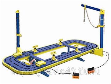 Стапель для восстановления геометрии кузова автомобилей, имеющих повреждения любой сложности. Платформа стапеля имеет продольные пазы, что позволяет устанавливать 4 кузовных захвата в любом месте платформы. Более того, наличие пазов позволяет полностью использовать поверхность платформы в процессе правки кузова. Кузовные захваты стапелей обеспечивают простую и быструю фиксацию кузова ремонтируемого автомобиля на платформе. Захваты крепятся болтом, имеют регулировку по высоте. Силовые стойки с гидравлическим приводом и тяговым усилием по 10 тонн свободно перемещаются вокруг платформы, что делает возможным приложение тягового усилия к любой точке кузова автомобиля. Высота приложения тягового усилия легко изменяется посредством изменения положения хомута со шкивом. Для удобства заезда и съезда автомобиля используется две въездные аппарели.