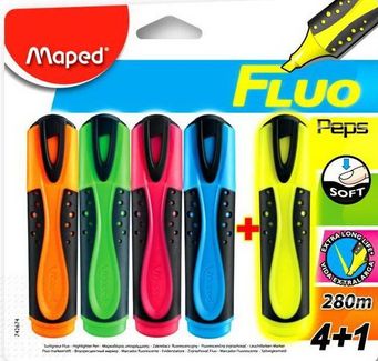 Текстовыделитель FLUO PEPS SOFT 1-5 мм, 4+1 цвет 5 шт блист. MAPED
