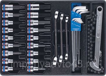 Набор включает в себя инструменты для работы с внутренним шестигранным профилем, а также профилем TORX. Входящие в состав разрезные ключи предназначены для работ с гайками, расположенными на трубках, длинных шпильках и т.п. Специальный цепной съёмник предназначен для работ по монтажу и демонтажу масляных фильтров. Материал ложемента – ПВХ (поливинилхлорид). Изготовлен специально для комплектации инструментальной тележки.