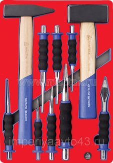 Набор инструментов 10 предметов молотки, зубила, выколотки, кернер Мастак 5-9010 в ложементе из материала EVA предназначен для комплектации передвижных инструментальных тележек или слесарных верстаков при создании индивидуальных рабочих мест на станциях технического обслуживания автомобилей и других предприятиях, занимающихся обслуживанием и ремонтом различной техники.