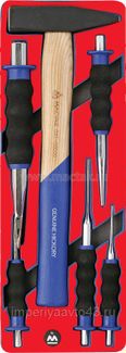 Набор инструментов 6 предметов молоток, зубила, выколотки, кернер Мастак 5-9006 в ложементе из материала EVA предназначен для комплектации передвижных инструментальных тележек или слесарных верстаков при создании индивидуальных рабочих мест на станциях технического обслуживания автомобилей и других предприятиях, занимающихся обслуживанием и ремонтом различной техники.