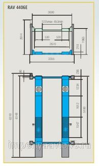 Электрогидравлический подъемник модели RAVAGLIOLI RAV4406E обладает грузоподъемностью до 4 тонн и высотой подъема до 1,965 м. двигатель имеет мощность 2,6 киловатта и вольтаж – 380 вольт. Стойки расположены на расстоянии в 3 м друг от друга. Платформы имеют габариты: ширину – 530 мм, длину – 5100 мм.