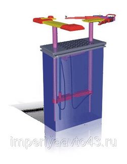 Благодаря уникальной схеме подъёмника вся нагрузка равномерно распределяется через раму на пол цеха. Синхронизацию цилиндров обеспечивает нижняя балка, жестко связывающая цилиндры. Гидравлическая станция находится непосредственно под верхней крышкой, что обеспечивает беспрепятственный доступ для ее обслуживания. Пульт управления выносной.