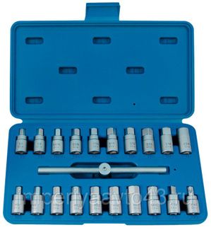 В состав набора входит 20 насадок различного профиля и размеров и вороток Т-образного профиля. Хромированное покрытие защищает инструменты от коррозии.
