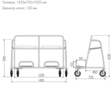 Внешние размеры (ВхШхГ) — 1035 x 1435 x 735 мм Грузоподъемность — 300 кг Диаметр колес — 150 мм None Можно купить без предварительного заказа. Возможен самовывоз. Есть доставка.