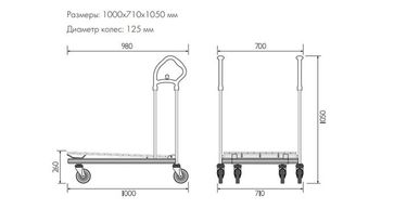 Внешние размеры (ВхШхГ) — 1050 x 710 x 1000 мм Размеры платформы (ШхГ) — 700 x 980 мм Грузоподъемность — 200 кг Диаметр колес — 125 мм None Можно купить без предварительного заказа. Возможен самовывоз. Есть доставка.