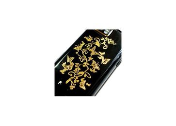 ЗОЛОТАЯ НАКЛЕЙКА - никелевая пластина с самоклеющимся основанием и напылением золота 24-карата. При производстве золотых наклеек используется гальванический процесс. Технически, это процесс синтезирования металлического объекта на молекулярном уровне. Золотые наклейки имеют толщину 0,02-0,05 мм. Уникальная технология производства золотой наклейки позволяет выполнять сложные дизайны с "разорванными" и удаленными элементами без нарушения геометрии. А так же, позволяет прописать мельчайшие детали изображения - вплоть до выражения глаз. Всю молитву "Отче наш" можно полностью уместить на площади 2х2 мм. Она не будет видна невооруженным глазом, но с помощью увеличительного стекла ее можно будет прочитать. Толщина линий рисунка - сотые доли миллиметра.