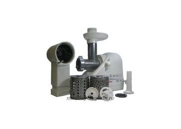 Гарантия производителя. Макс. мощность 400вт.в комплекте: две решетки для фарша, спец. насадка для набивания домашних колбас, насадки -каркасы для профилирования теста для выпечки и пельменей , приставки-шинковки с двумя барабанами для крупного и мелкого истирания. None
