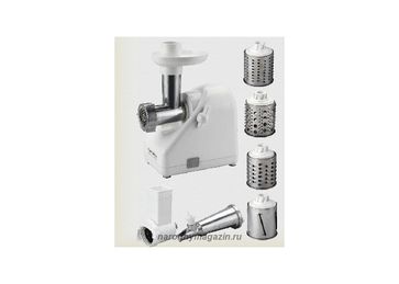 Гарантия производителя. Мощность 1500вт. производ-ть 35 кг/час. функция реверс. привод шнека из нерж. стали. отделение для шнура питания. цвет белый. корпус пластик. высокая перемалывающая способ-ть.эмш-32р–насадка –мясорубка, к-кт из 4 насадок для шинкования овощей. None