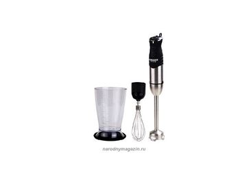 Гарантия производителя. Макс. мощность: 800 вт. электропитание: 220 в, 50 гц. 5 скоростных режимов. режим турбо. нож из нерж. стали. насадка из нерж. стали. противоскользящее покрытие корпуса. низкий уровень шума. мерный стакан: 500 мл, венчик. None