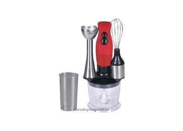 Гарантия производителя. Макс. мощность 250вт. 2 скоростных режима. 3 типа сменных насадок: – насадка для смешивания; – насадка для взбивания; – измельчитель объем 0,5л . насадки и ножи из нерж. стали. • подставка для компактного хранения насадок. цвет красный с черным. None