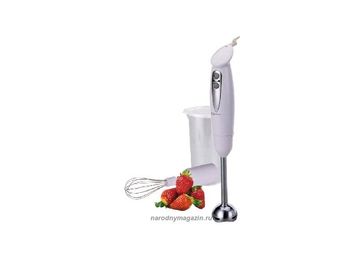 Гарантия производителя. Мощность 400вт. погружной. корпус из высококач. пластика. ножи из нерж. стали. 2-х скоростной режим работы. съемная насадка блендер из нерж. стали. насадка-венчик. мерный стакан 600мл. макс. время непрерывной работы 1мин. двигатель повышенной мощности None