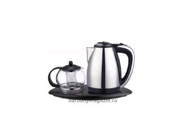 Гарантия производителя. Мощность чайника 1500 вт, набора — 1850вт. в наборе: чайник из нержавейщей стали объем 1,8л и стеклянный заварочный чайник объем 0,8л . функция подогрева заварочного чайника, ситечко для заварки из нерж. стали, защита от работы без воды. None