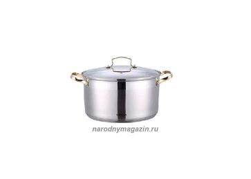 Гарантия производителя. Стальная кастрюля со стекл. крышкой. ручки стальные с покрытием "под золото". подходит для индукционных плит. размеры: 22х13,5-5,0л. None