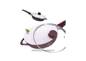 Гарантия производителя. Сковорода из алюминия с крышкой, внутри с антипригарным керамич. белым покрытием. стекл. крышка. съемная бакелитовая ручка. можно мыть в посудомоечной машине. подходит для индукционных плит. размер: 24х6,5см. - 2,5л. None