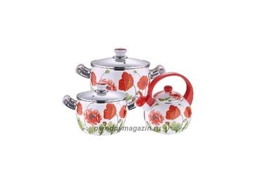 Гарантия производителя. Набор посуды 5 пр. эмаль, кастрюля: 20см, 4.4л, 22см, 5.5л, с крышкой; чайник 2,5 л,с пластиковой ручкой, покрытие: внутри эмаль, снаружи покрытие: эмаль с деколями, покрытие ручек-керамическое . None