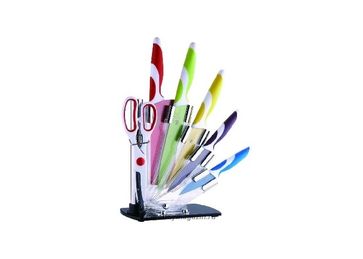 Гарантия производителя. Набор ножей 7 пр. нжс,цветное полимерное покрытие,антибактериальное покрытие, нож - 17,5см, нож для нарезки - 20см, универсальный нож - 12,5см, нож для чистки овощей - 9см, филейный нож 15см, ножницы, ручки с покрытием soft-touch, пластиковая подставка. None