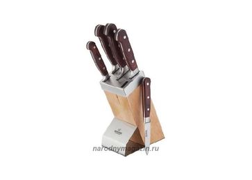 Гарантия производителя. Наб. ножей 6 пр. лезвия ножей из нерж. стали толщиной 3.0-2.5мм, высокая степень полировки поверхности стали для долгой службы, можно мыть в посудомоечной машине, 5 ножей из специальной стали, 1 деревянная подставка. None