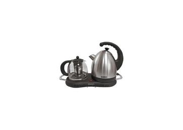 Гарантия производителя. Мощность 2000вт чайный набор: - электрочайник и стеклянный заварочный чайник - подогрев заварочного чайника - ситечко для заварки из нержавейки чайник: - объем 1,7л - световой индикатор работы - автоматический выключатель - закрытый None