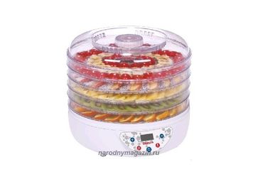Гарантия производителя. Мощность 220-240 вт.тип управления кнопочный электронный . дисплей led. кол-во ярусов 5. размеры одного яруса: диаметр 30 см, высота 3 см. регулируемый термостат. отключение при перегреве. None