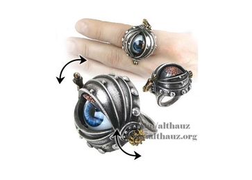 Кольцо Automatons Eye отличный представитель украшений в стиле стим панк .Имеет функцию открывания и закрывания.Можно носить в двух положениях- открытое и закрытое.Покрыто узорами викторианской техно эпохи.Создано по почти забытым технологиям . Является прототипом видео технологий.Выплавлено в ручную , британскими мастерами.Материал- высококачественный ювелирный сплав.Присутствует клеймо и год создания коллекции.